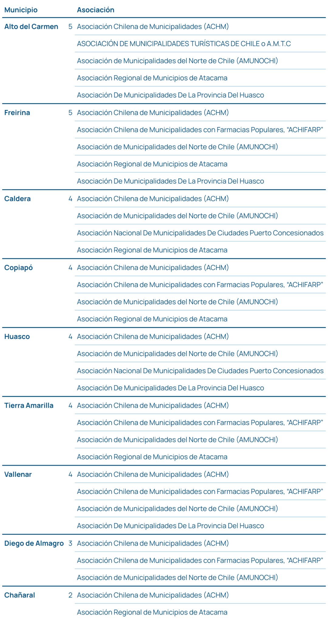 Chañaral / Diego de Almagro / Caldera / Copiapó / Tierra Amarilla / Huasco / Freirina / Vallenar / Alto del Carmen