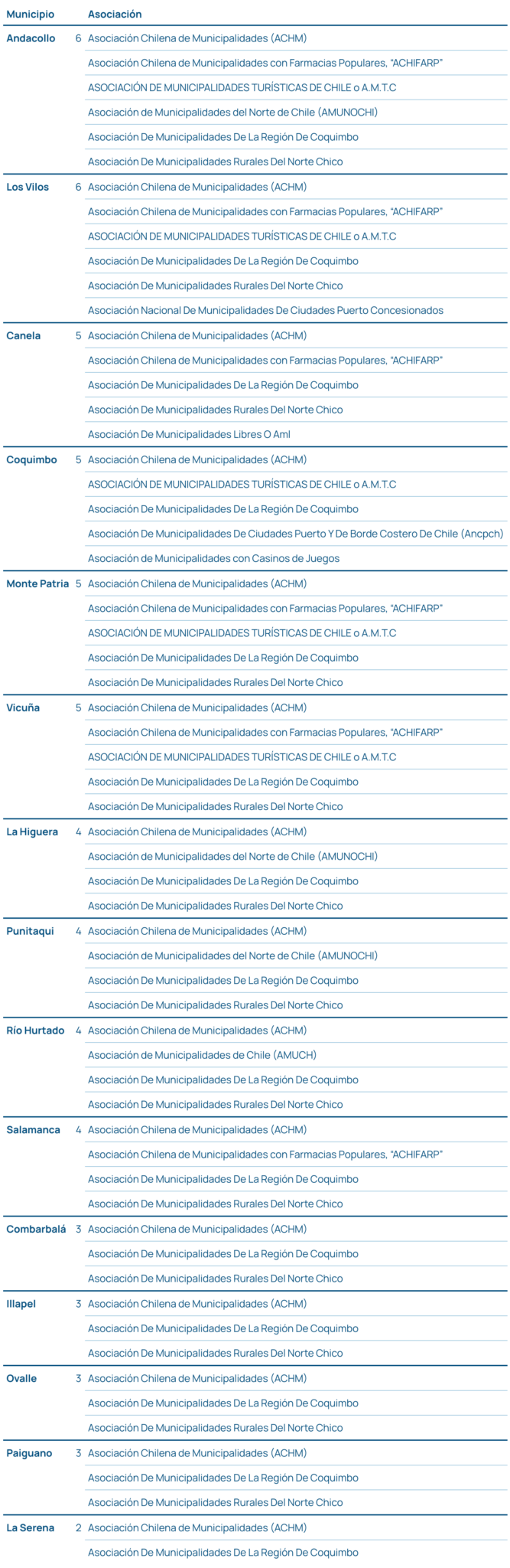 Andacollo / Coquimbo / La Higuera / La Serena / Paihuano / Vicuña / Combarbalá / Monte Patria / Ovalle / Punitaqui / Río Hurtado / Canela / Illapel / Los Vilos / Salamanca