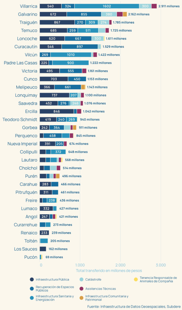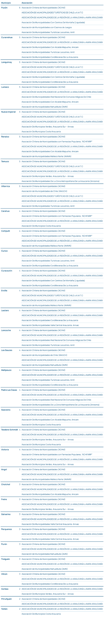 Carahue / Cholchol / Cunco / Curarrehue / Freire / Galvarino / Gorbea / Lautaro / Loncoche / Melipeuco / Nueva Imperial / Padre Las Casas / Perquenco / Pitrufquén / Pucón / Saavedra / Temuco / Teodoro Schmidt / Toltén / Vilcún / Villarrica / Angol / Collipulli / Curacautín / Ercilla / Lonquimay / Los Sauces / Lumaco / Purén / Renaico / Traiguén / Victoria