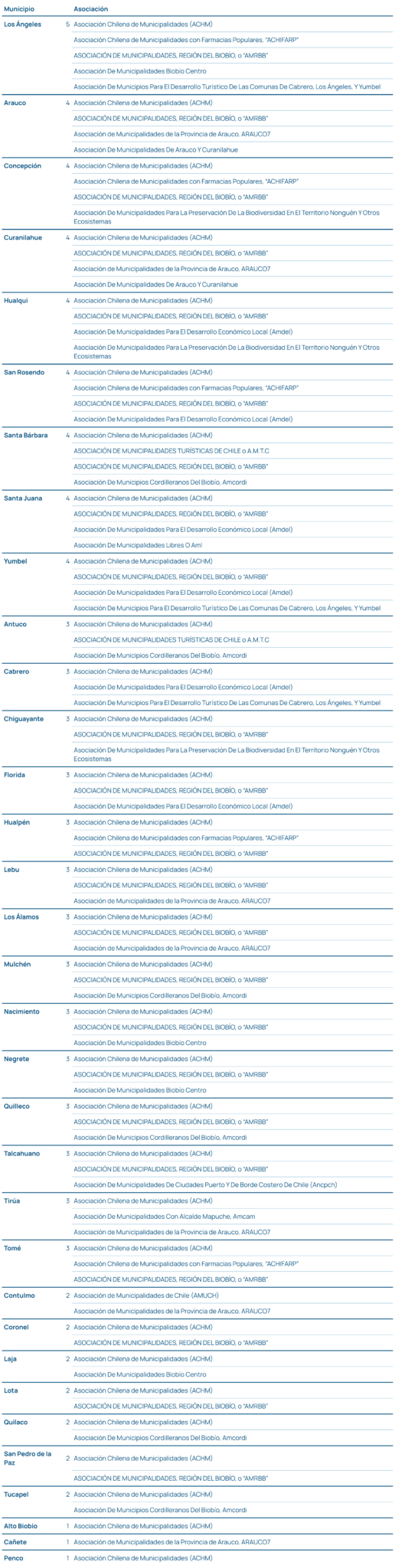 Arauco / Cañete / Contulmo / Curanilahue / Lebu / Los Álamos / Tirúa / Alto Biobío / Antuco / Cabrero / Laja / Los Ángeles / Mulchén / Nacimiento / Negrete / Quilaco / Quilleco / San Rosendo / Santa Bárbara / Tucapel / Yumbel / Chiguayante / Concepción / Coronel / Florida / Hualpén / Hualqui / Lota / Penco / San Pedro de la Paz / Santa Juana / Talcahuano / Tomé